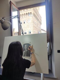Quando ho visto quel video non ci ho capito più niente: il cuore ha iniziato a battermi forte, volevo essere in grado di fare quelle cose anche io! Così sono risalita alla fonte di quel video e come regalo di compleanno mi sono recata a Firenze presso la Bottega dell'Arcimboldo dal Maestro Domenico Mileto dove insegnavano a fare “quelle cose” spaziali. Ho frequentato 3 mesi di Accademia diluiti in un anno e mezzo, perché ho un lavoro a tempo pieno e non potevo assentarmi per 3 mesi di fila. Il Maestro mi aveva eccezionalmente concesso di andare saltuariamente quando potevo, perché aveva capito che a casa mi sarei impegnata molto e perché, dopo avermi fatto fare un test nel giorno del mio compleanno, aveva visto che avevo un talento naturale. E ci aveva visto bene, ho bruciato tutte le tappe e mi sono ritrovata a 50 anni a scoprire di essere nata con un dono per la matita.