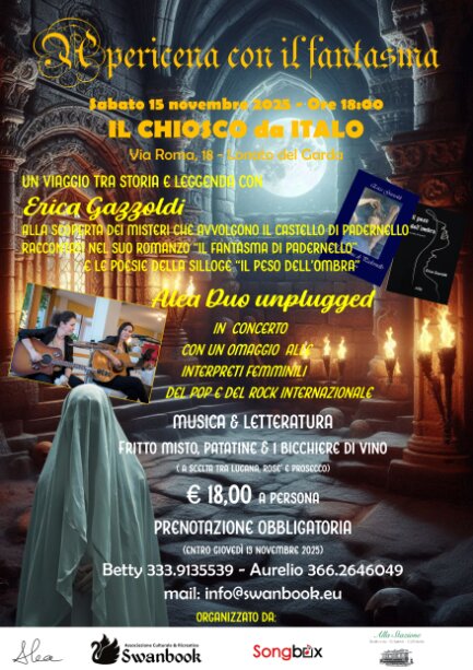 Erica presenterà due suoi libri, entrambi editi da Swanbook, una raccolta di poesie dal titolo “Il peso dell’ombra” e il romanzo “Il fantasma di Padernello”, una vicenda ambientata nello splendido castello situato nella Bassa Bresciana dove aleggia da secoli la presenza di un fantasma, quello di Biancamaria (la Dama Bianca) che ogni 10 anni nella notte del 20 luglio ripercorre le stanze dell’antico maniero che l’ha ospitata fino alla sua morte. Sarà leggenda? O forse no?