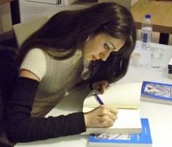 La nostra Jennifer Bertasini mentre firma dediche sui suoi libri durante una presentazione.