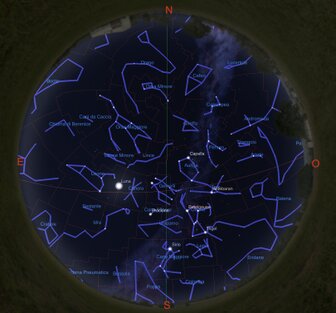 al suo fianco la stella Aldebaran (l’occhio rosso del Toro), presenti inoltre Auriga e i Gemelli che con le stelle Castore e Polluce ci accompagnano per tutta la notte,