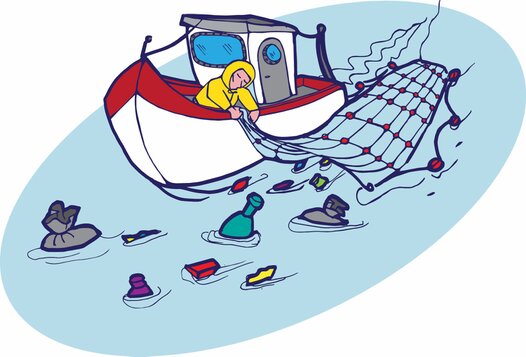 calato in mare, il grande sacco comincia a riempirsi di bottiglie, sacchetti,