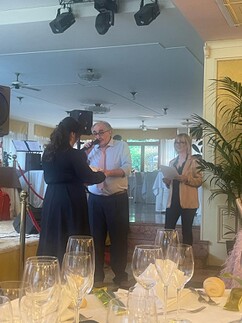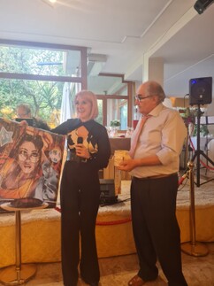 Terminato questo coinvolgente momento teatrale, sono iniziate le premiazioni, precedute dal benvenuto agli ospiti presenti e dai ringraziementi di rito a chi ha reso possibile la realizzazione della serata. Armio Aurelio ha subito citato la Famiglia Bazzani e tutto lo staff del Conca D'Oro, per poi proseguire col ringraziare le Cantine Scolari e Bottenago che hanno fornito i vini per la cena; poi in rapida successione il grazie a SolLucet Trading di Lucca che ha messo a disposizione tre kit per realizzare impianti fotovoltaici da 3 kw; Busi Giovanni s.r.l. di Botticino che ha sponsorizzato i premi Territorio & Cultura; Immobialiare Bonora che a sua volta a offerto i premi per "La saga della libertà"; quindi Simona Pisaroni, l'artista che ha relizzato le opere in ceramica raku che sono state assegnate ai vincitori, Ornella De Rosa che ha donato la stampa autografata di un suo dipinto e per finire la BCC del Garda e dei Colli Morenici, a sua volta sponsor per i premia assegnati ai poeti.